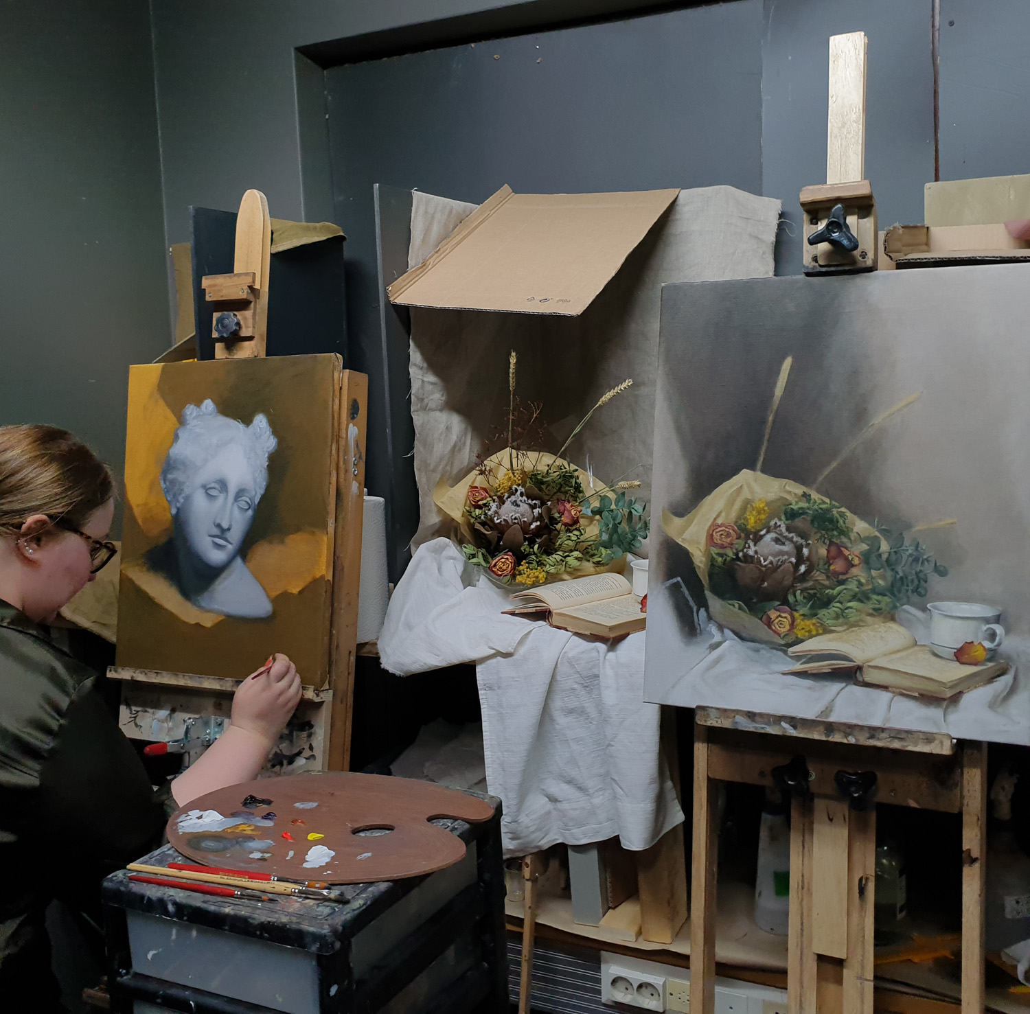Jatkokurssilaisilla on mahdollisuus käyttää studiota myös klo 11-15. Studion ovet aukeavat lauantaisin klo 11:00 ja sulkeutuvat 15:00. Maalaamista voi jatkaa klo 15:00 jälkeenkin, niin pitkään on itselle sopii.