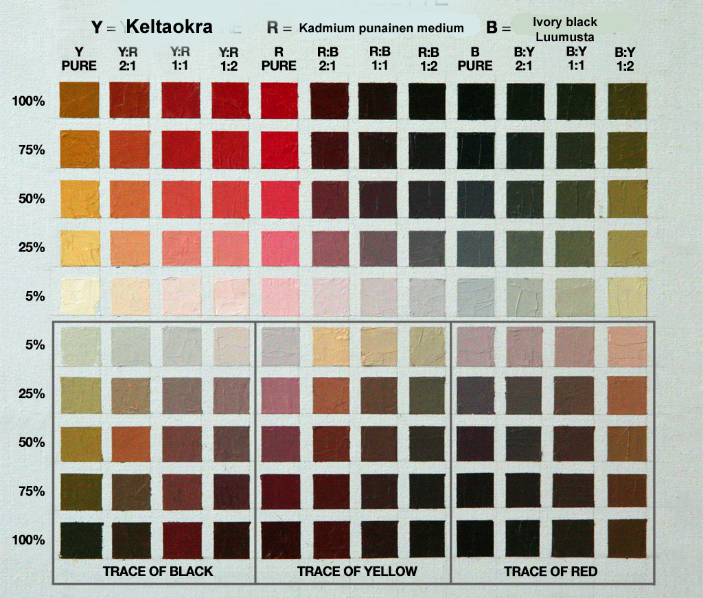 Ohessa on taulukko, joka sopii mainioksi sekoitusharjoitukseksi aloittelevalle maalarille. Alkuun on kuitenkin hyvä aloittaa sekoittamalla muutama tärkeä sävy ymmärtääkseen pigmenttien hienovaraisuudet.