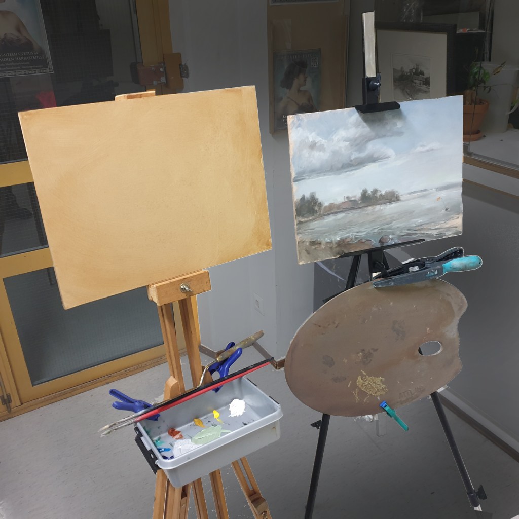 -Puinen paletti tai jonkinlainen telineeseen kiinnitettävä öljymaalia imemätön laatikko, jota voidaan käyttää palettina. (Koululla on useampi tällainen maalausboksi lainattavissa)