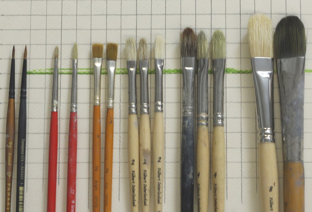 Tärkeää on ottaa valikoimaan mukaan ainakin yksi iso pensseli, kuten oikealla olevat sian harjainen ja keinokuituinen. Loput kolme sivellintä olisi hyvä olla jotakin keskikokoisia, kuten kuvan keskellä olevat. Hyvä olla mukana myöskin yksi hyvin pieni, kuten vasemmalla olevat kaksi näädän karvaista.